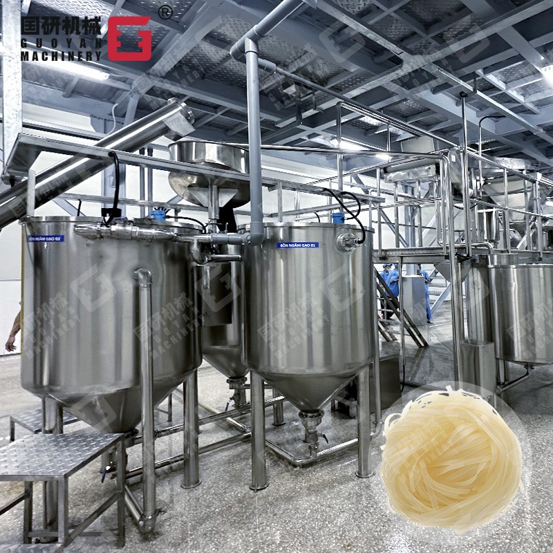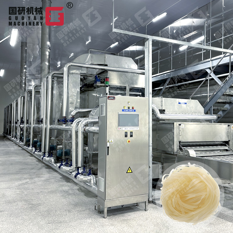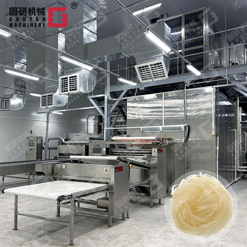 大米→射流提升输送→除砂石→射流洗米、浸米→米水分离→磨浆→筛滤→储浆→蒸粉片→粉片预干→低温自动吊挂老化→自动切条、切断→定重压形→干燥→包装→成品